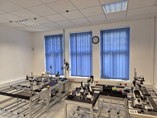 4 | Robotske celice 3, 4, 5, 6 in 7 | Moduli 3, 4 in 5 se uporabljajo za montažne operacije, modula 6 in 7 pa za kontrolo kakovosti. Glavne komponente: robotska roka Magician, transportni trak z optičnimi senzorji, robotski vid z industrijsko HD barvno kamero, skladiščna mesta za barvne kocke ter gravirne kartice ali palete. Imajo eno vstopno in eno izstopno točko, pripravljeno za AMR, kar omogoča nalaganje in razlaganje delov in palet na transportne trakove ali v skladiščna mesta. |